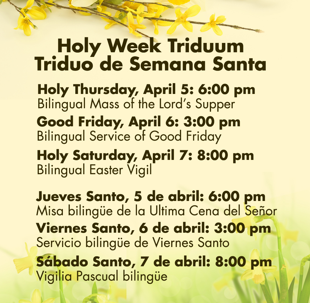 Noticias de educación religiosa: En la Vigilia Pascual, el sábado 7 de abril, a las 8:00 pm los alumnos que asisten al programa de RCIA recibrán los sacramentos de Iniciación Cristiana. El Domingo de Pascua, el 8 de abril, no tendremos clases.