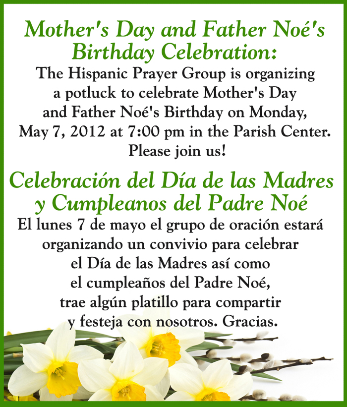 Ramillete Espiritual por el Día de las Madres: Hemos puesto un sobre en cada boletín para el Día de las Madres. Favor de llevárselo a sus casas y proveer la información; los puede regresar el próximo domingo. Las intenciones serán ofrecidas el Día de las Madres, el domingo 13 de mayo. ¡Gracias!