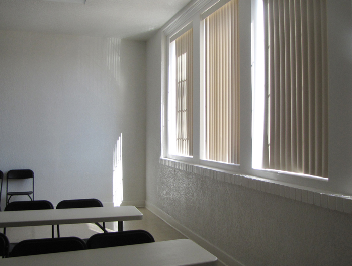 upstairs classrooms with new drywall, paint, window blinds, tables, chairs and air conditioning!