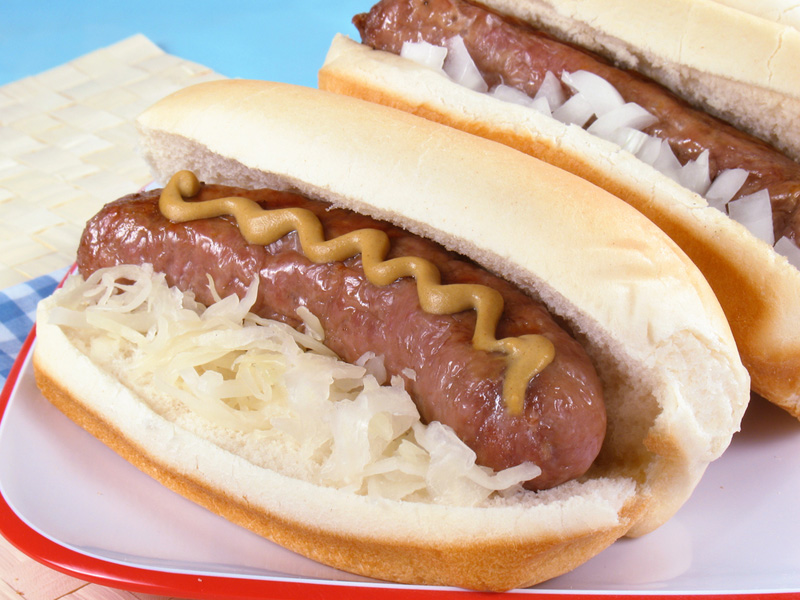 Slovenian sausage with sauerkraut on a hard roll