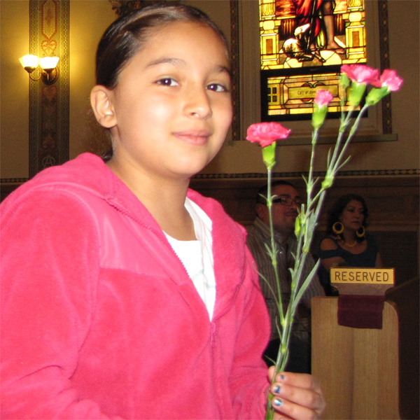 Children bring flowers to Mary