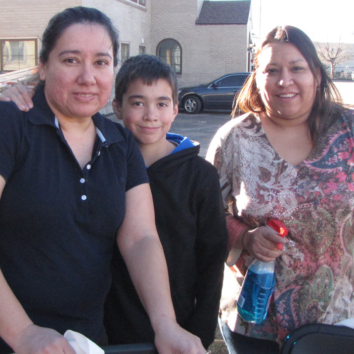 Early arrivals cleaning the folding chairs outside