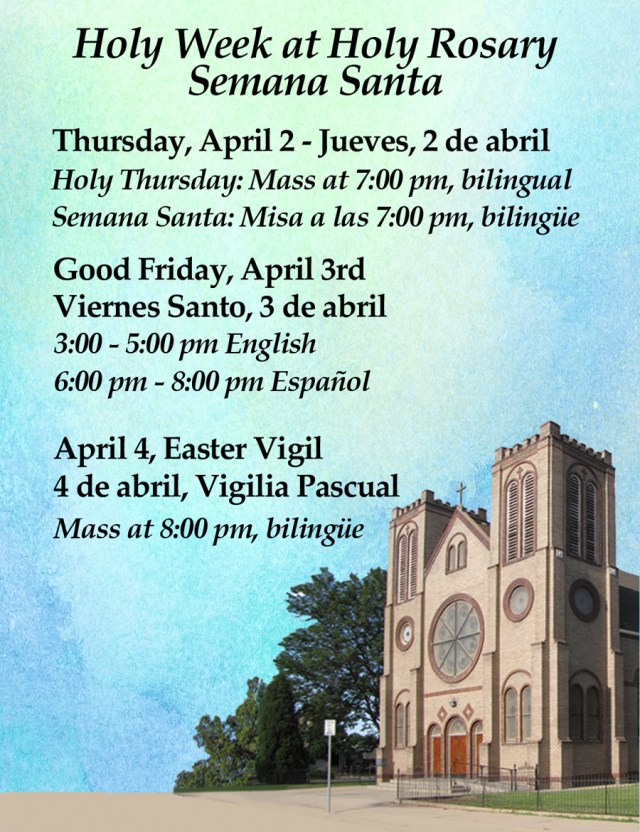 NO 9:00 am Mass – Bilingual Easter Vigil Mass at 8:00 pm